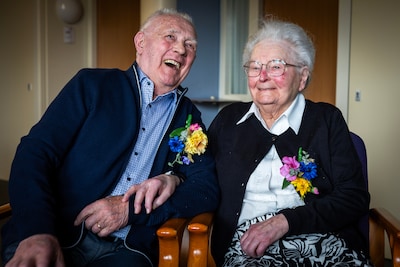 Eigenlijk zouden Dirk (90) en Jansje Sprakel-Seppewoolde (90) om half twee trouwen op 27 mei 1950, maar een belangrijk persoon ontbrak. „De dominee was de tijd vergeten. Hij had zijn klompen nog aan en werkte in de tuin. Hij moest door de broer van Dirk worden opgehaald.”